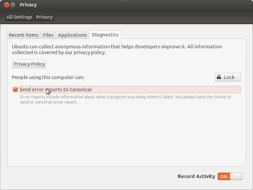 Εκεί κάντε κλικ στο "Ξεκλείδωμα", δίνετε τον κωδικό σας και ξε-τικάρετε την επιλογή για αποστολή σφαλμάτων στην Canonical.